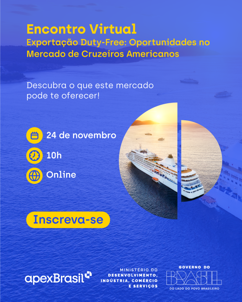 A ApexBrasil promoverá, no dia 24 de novembro de 2025, o evento “Exportação Duty-Free: Oportunidades no Mercado de Cruzeiros Americanos”, que ocorrerá de forma totalmente online. O objetivo é apresentar um novo e promissor canal de exportação para os Estados Unidos, voltado ao abastecimento duty-free de cruzeiros, um segmento isento de tarifas e com alto potencial de crescimento.